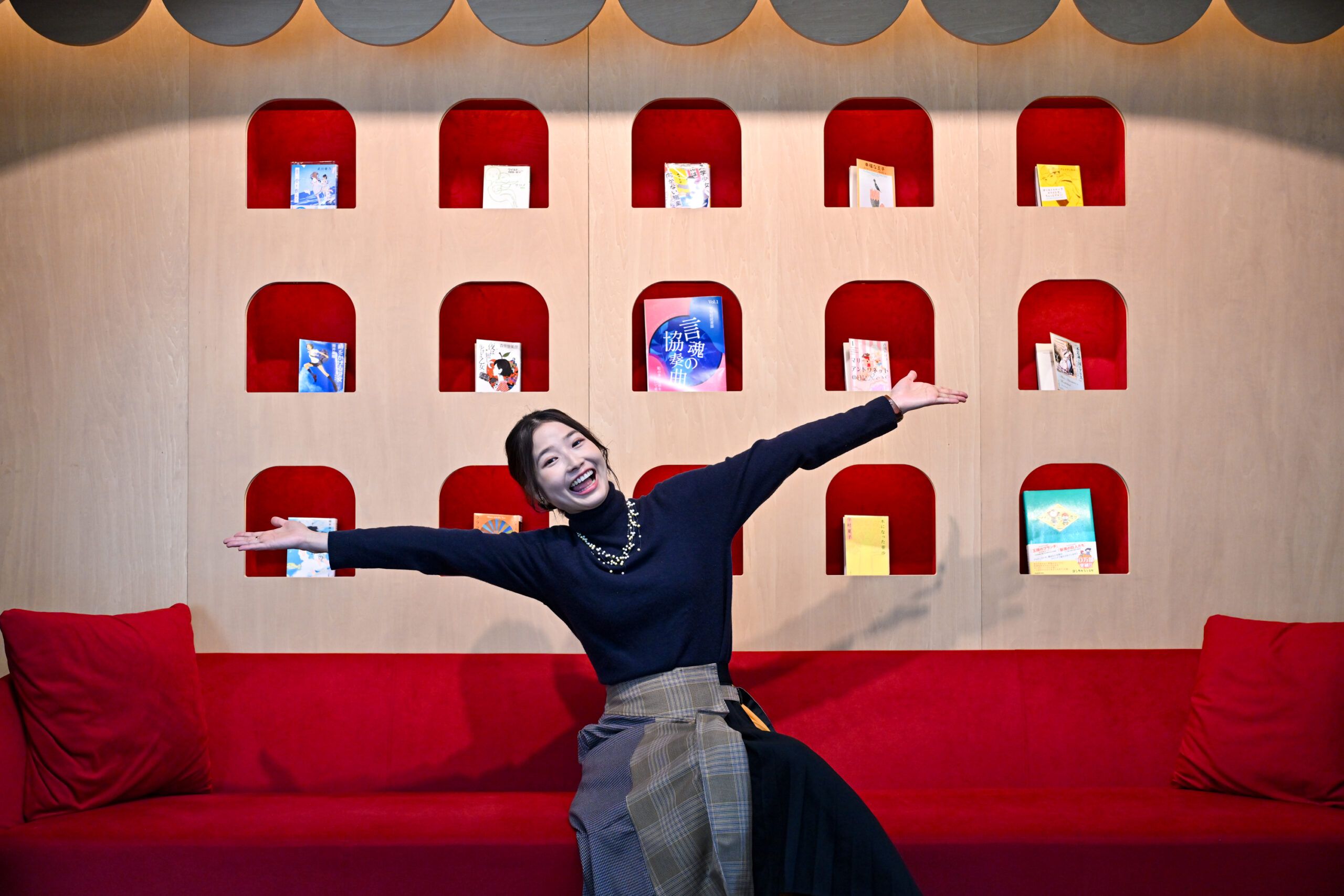 そこから,自分の感性を持って,それを表現して,誰かと交流するというところまで見越した場所にしたいと思ってプロデュースしました。名前が「ビブリオステージ」というのですが,ちょっと舞台調になっています。長椅子のソファがあり,後ろにニッチがあって,くり抜かれた部分に本が面で飾れる。絵本世界のようなアーチ状の木の枠がある舞台のようにしました。